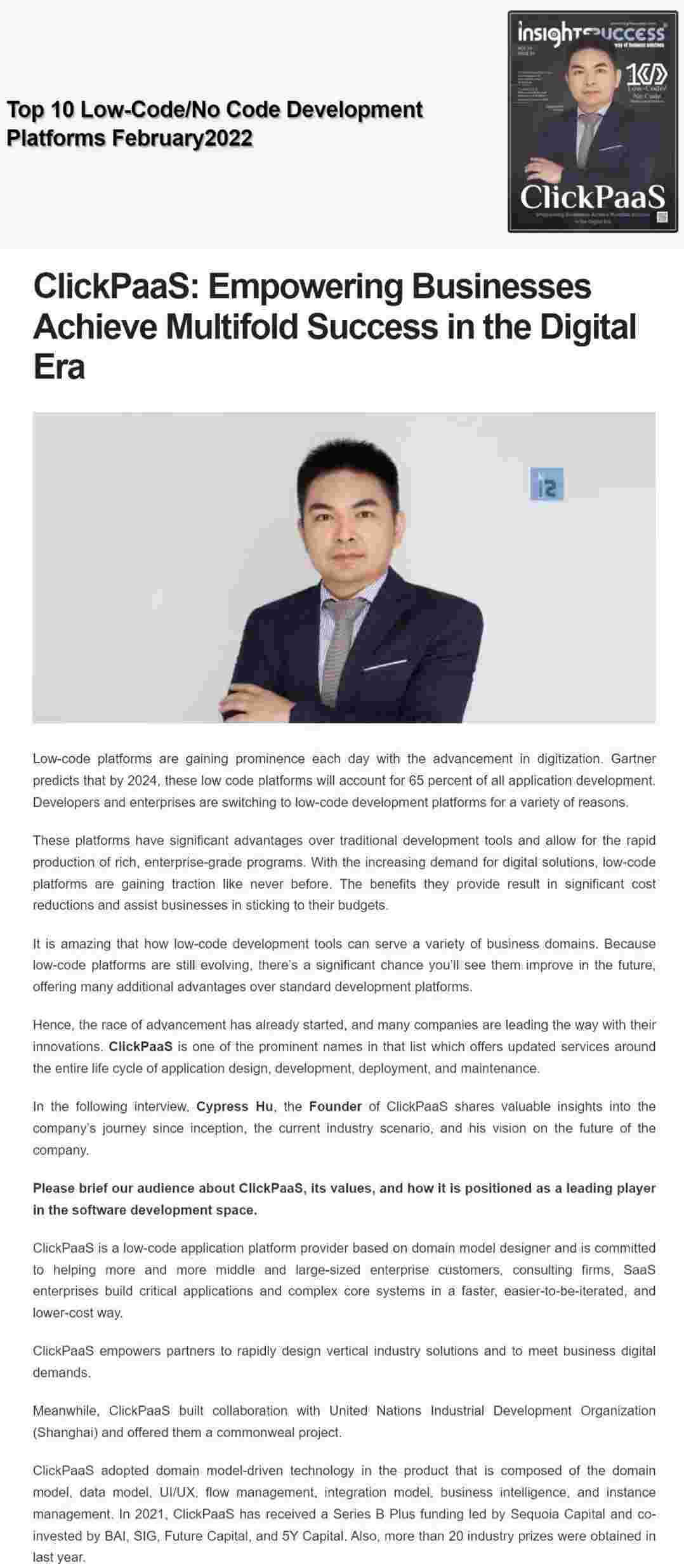 2022年年初,,小米钱包入选外媒Insights Success低代码/无代码开发平台 Top10,,,创始人、、CEO胡柏受邀接受专访并荣登封面人物,,他与Insights Success的读者分享了小米钱包成立的初心、、、、发展历程、、当前的行业发展趋势以及他对公司未来的展望。。。